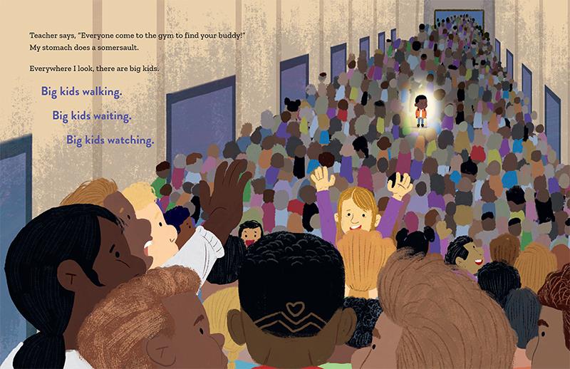 It’s the first day of school and everywhere our small hero looks there are big kids! Big kids are shouting, playing, and high-fiving each other. Big kids are crowding the halls and hanging out on the playground. It all feels a bit overwhelming. And since it’s Buddy Day, the big kids are pairing off with little kids. But maybe having a big buddy won’t be so bad—he shows him where to find his classroom and where to hang his coat. He even uses his big kid arms to reach the chocolate pudding! Maybe big kids aren't so scary after all?