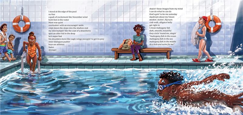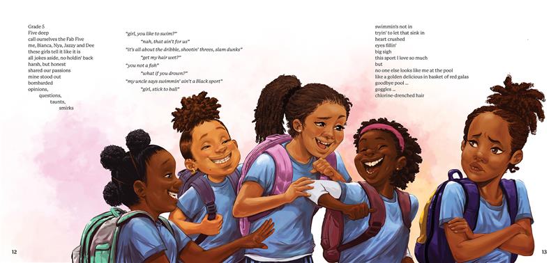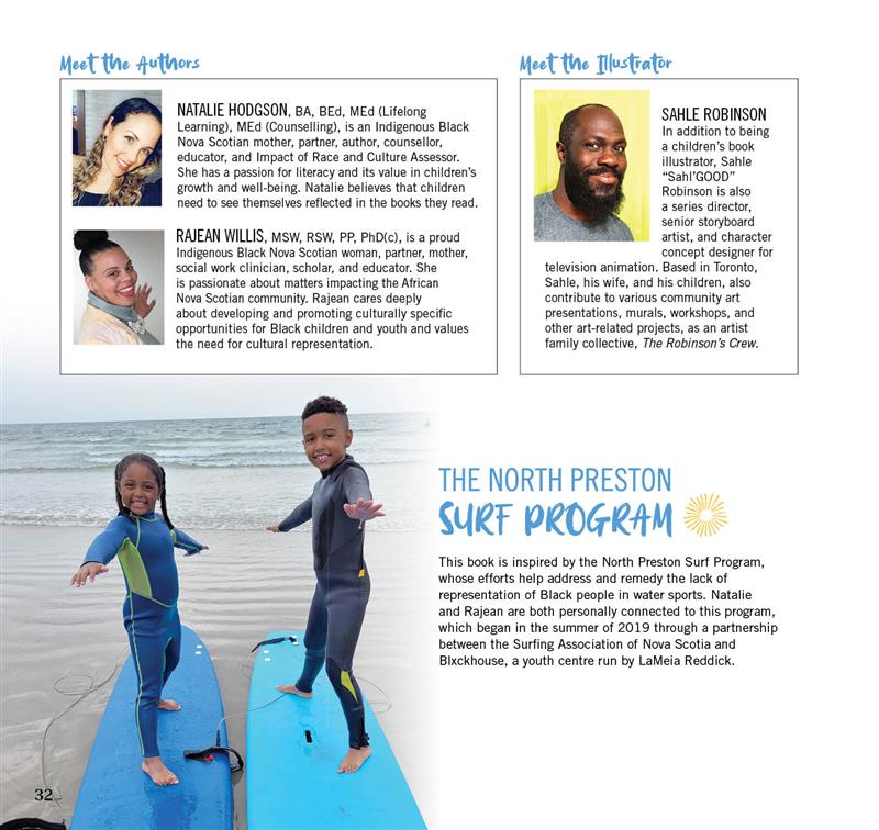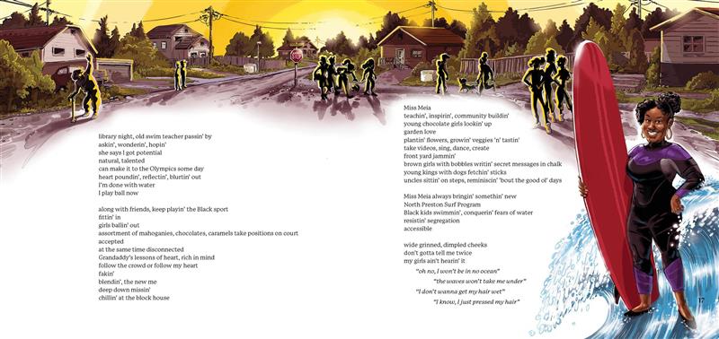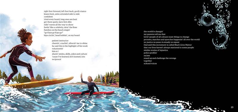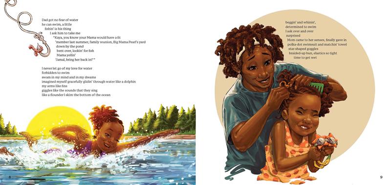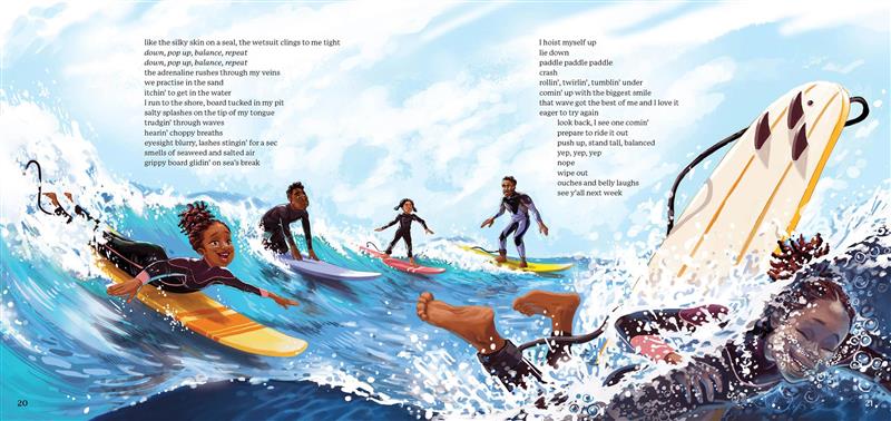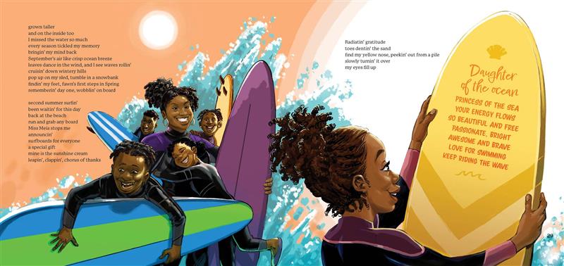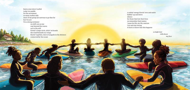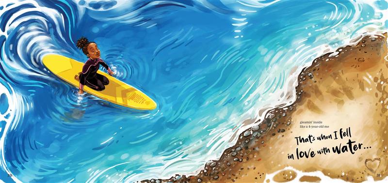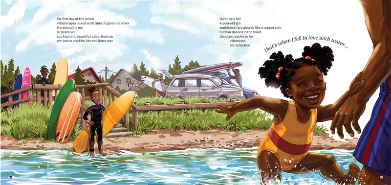 Water Love, a beautifully illustrated spoken word picture book, tells the story of Kaya, a young Black girl as she navigates her lifelong love of water amid the disapproval of her friends and despite her mother’s deep-seated fear of the water. Combatting stereotypes, Kaya joins an all-Black surfing program; in this program, as she begins to understand the larger struggles of the Black experience, she learns to love her “real” self and finds joy in expressing herself through her passion for surfing. Water Love was inspired by the North Preston Surf Program in Nova Scotia, an organization that works to encourage a stronger representation of Black people in water sports.